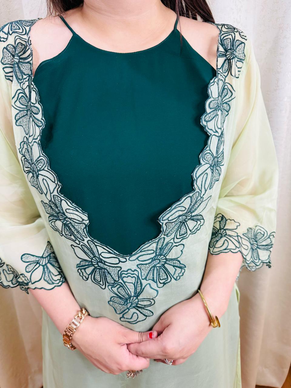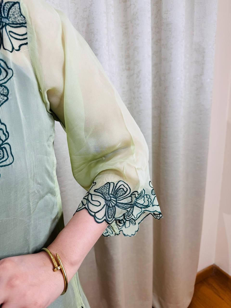 This three piece set is made of pure viscos organza and comes in sizes L and XL. The fabric provides a luxurious and ethereal look, perfect for any occasion. Elevate your wardrobe with the ANA set, a must-have for any fashion-forward individual.