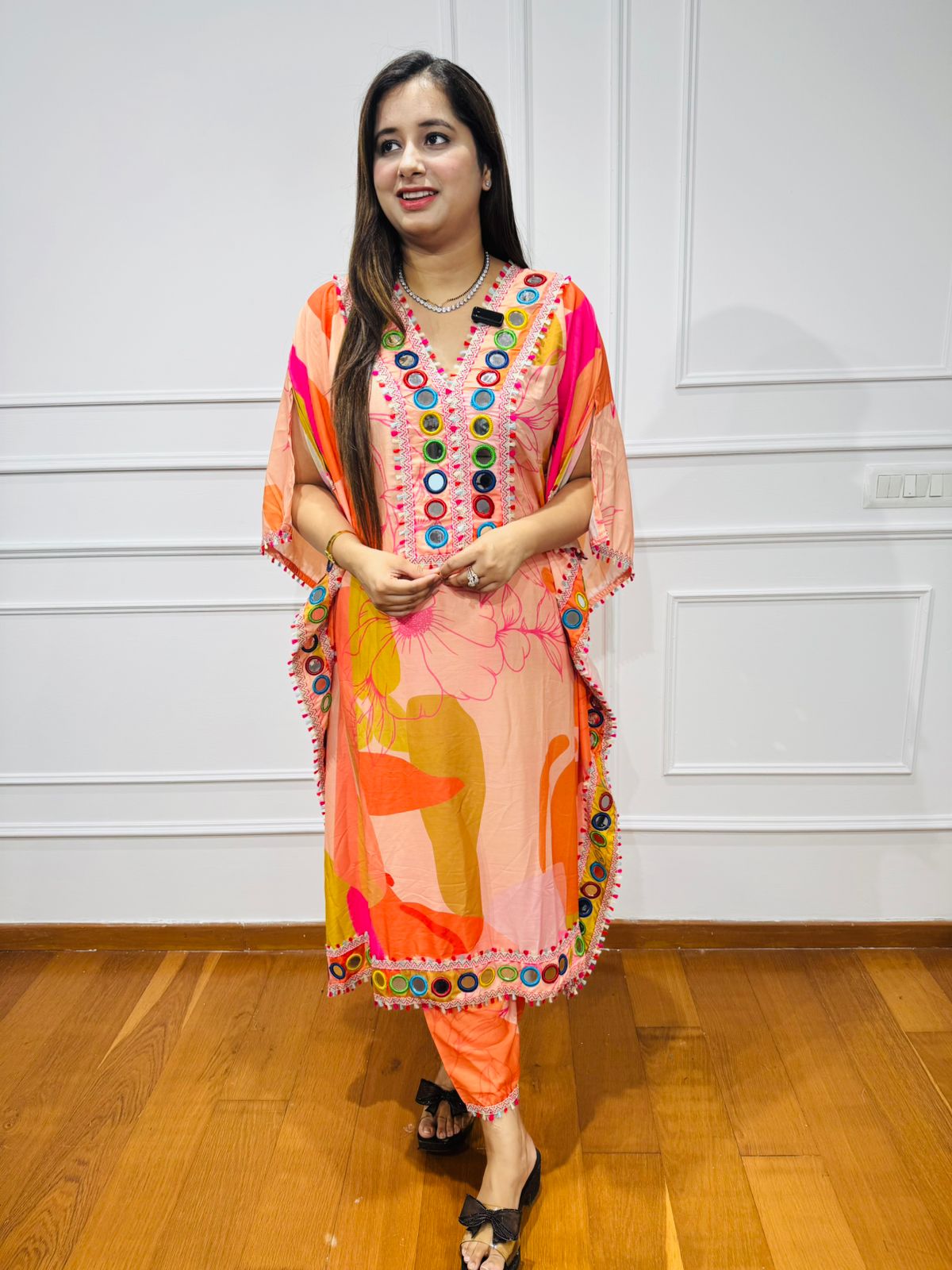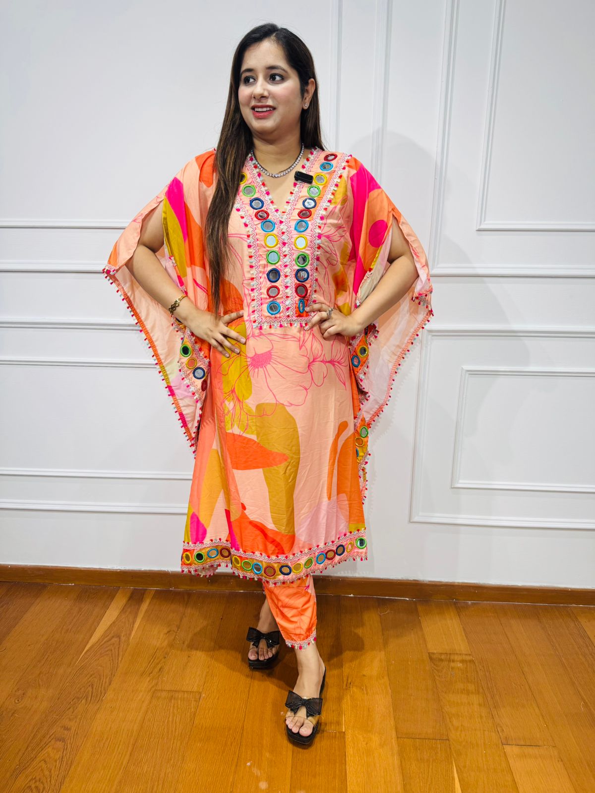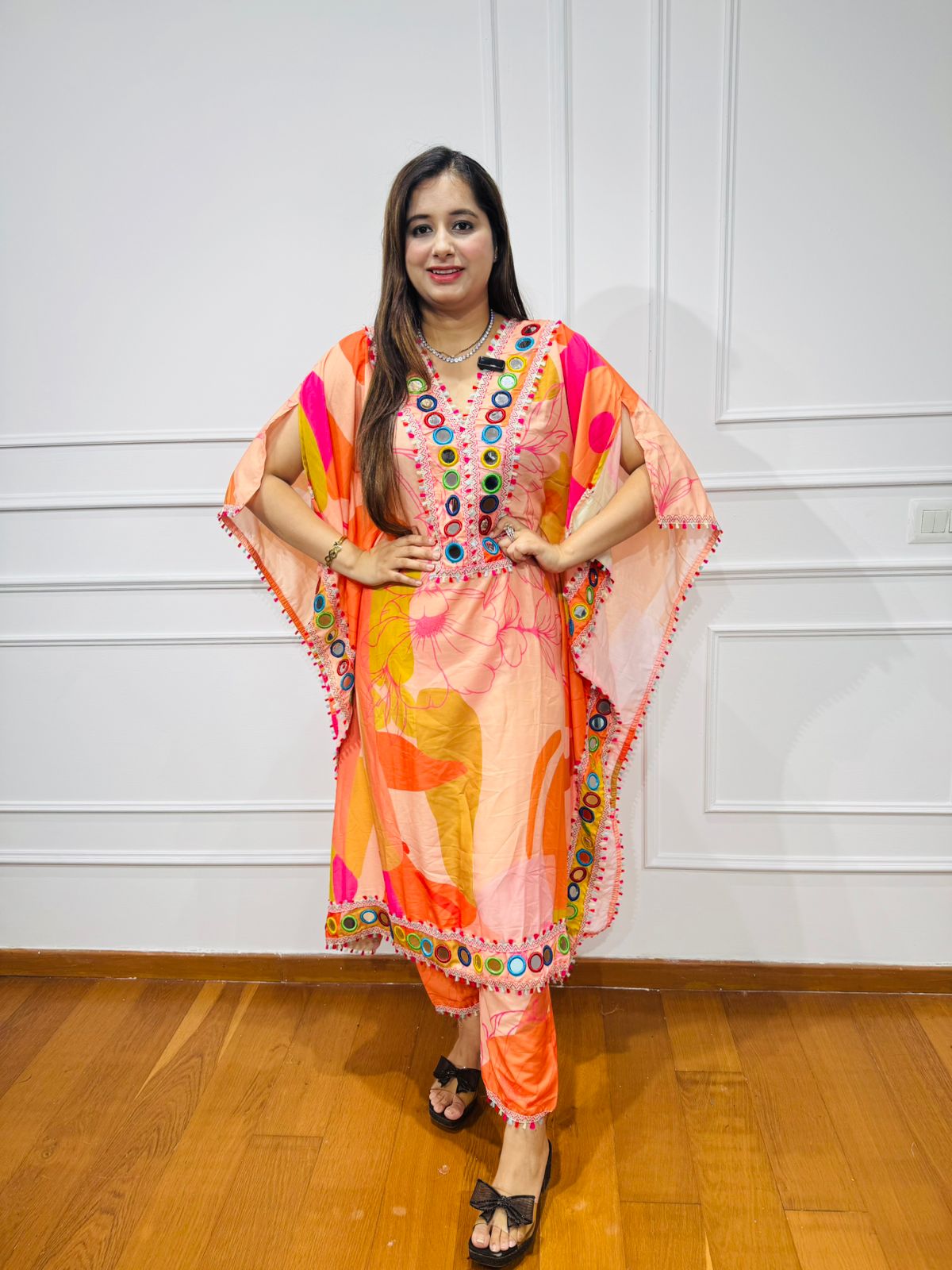 Step into vibrant comfort with the "Sameera" two-piece kaftaan set in bright orange. Crafted from pure muslin fabric, it offers a soft, breathable feel perfect for any occasion. Available in large, XL, and XXL, this playful ensemble comes complete with a charming potli bag to add a touch of whimsy to your look. Embrace effortless style and ease with this delightful set!