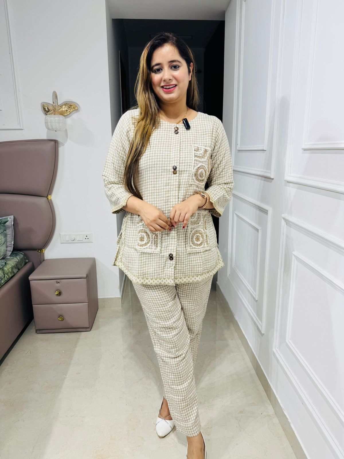 Chic, subtle, and effortlessly elegant ā the Ecru Coord Set brings timeless charm to your everyday style. Designed in a soothing beige houndstooth pattern with intricate lace and button detailing, this set perfectly balances sophistication with comfort.