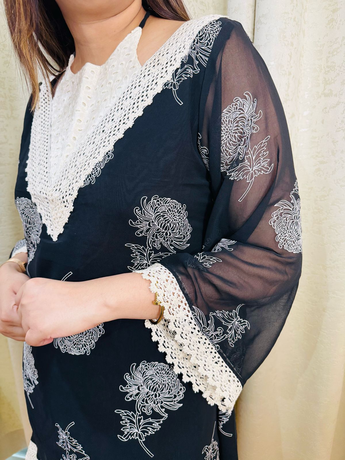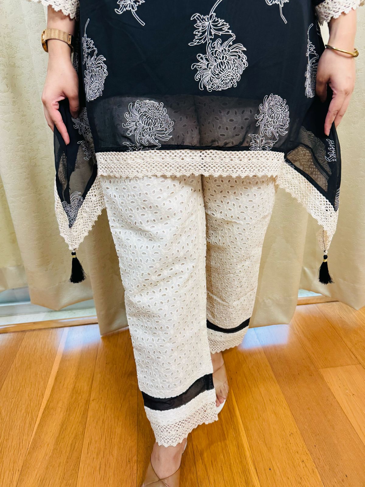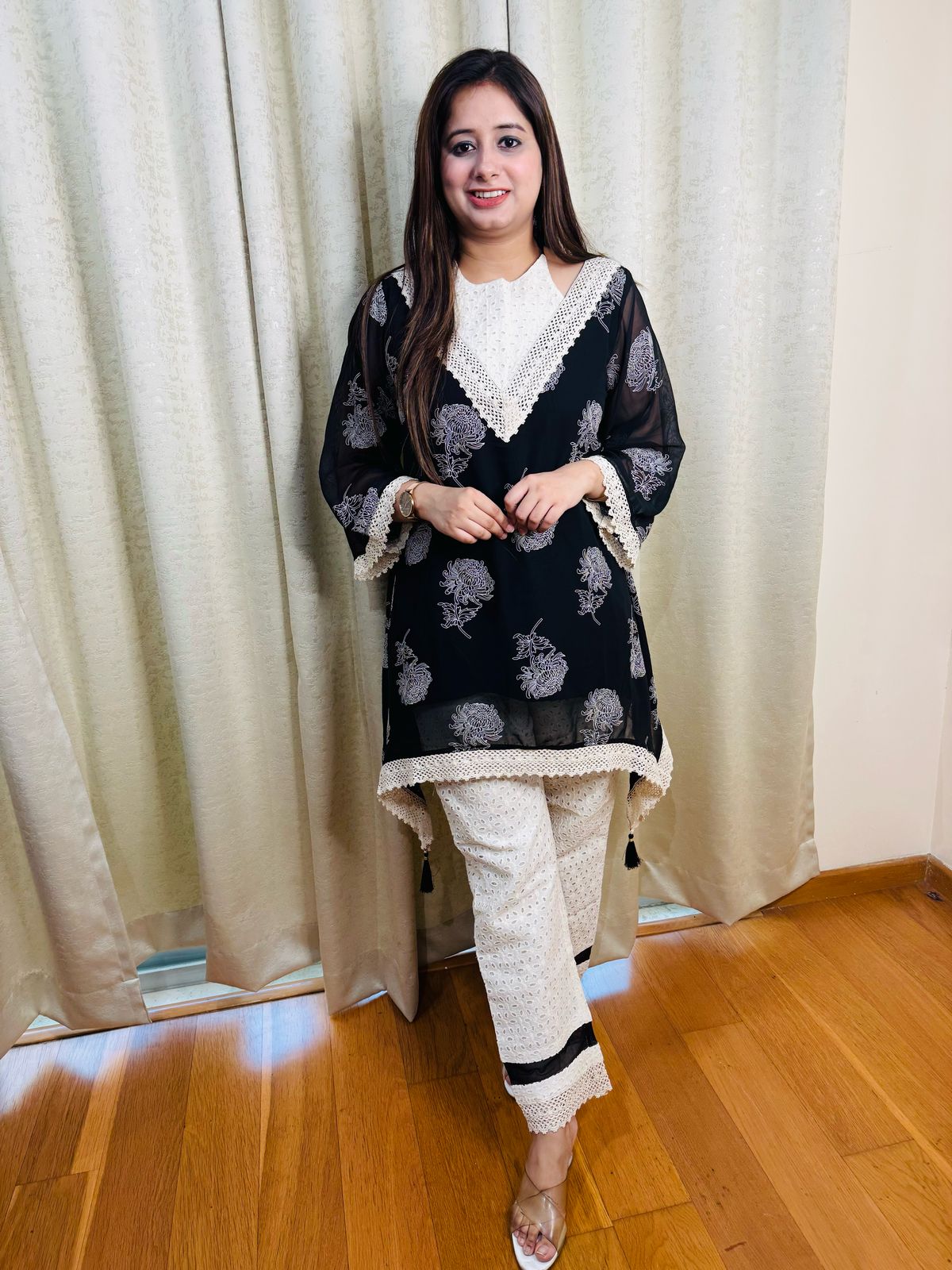 TEENA Two Piece Set features a pure gorgette upper with cotton lining, providing comfortable and breathable wear. Available in sizes Large to XXXL, this set offers a perfect fit for a flattering look. Upgrade your wardrobe with this elegant two piece set.