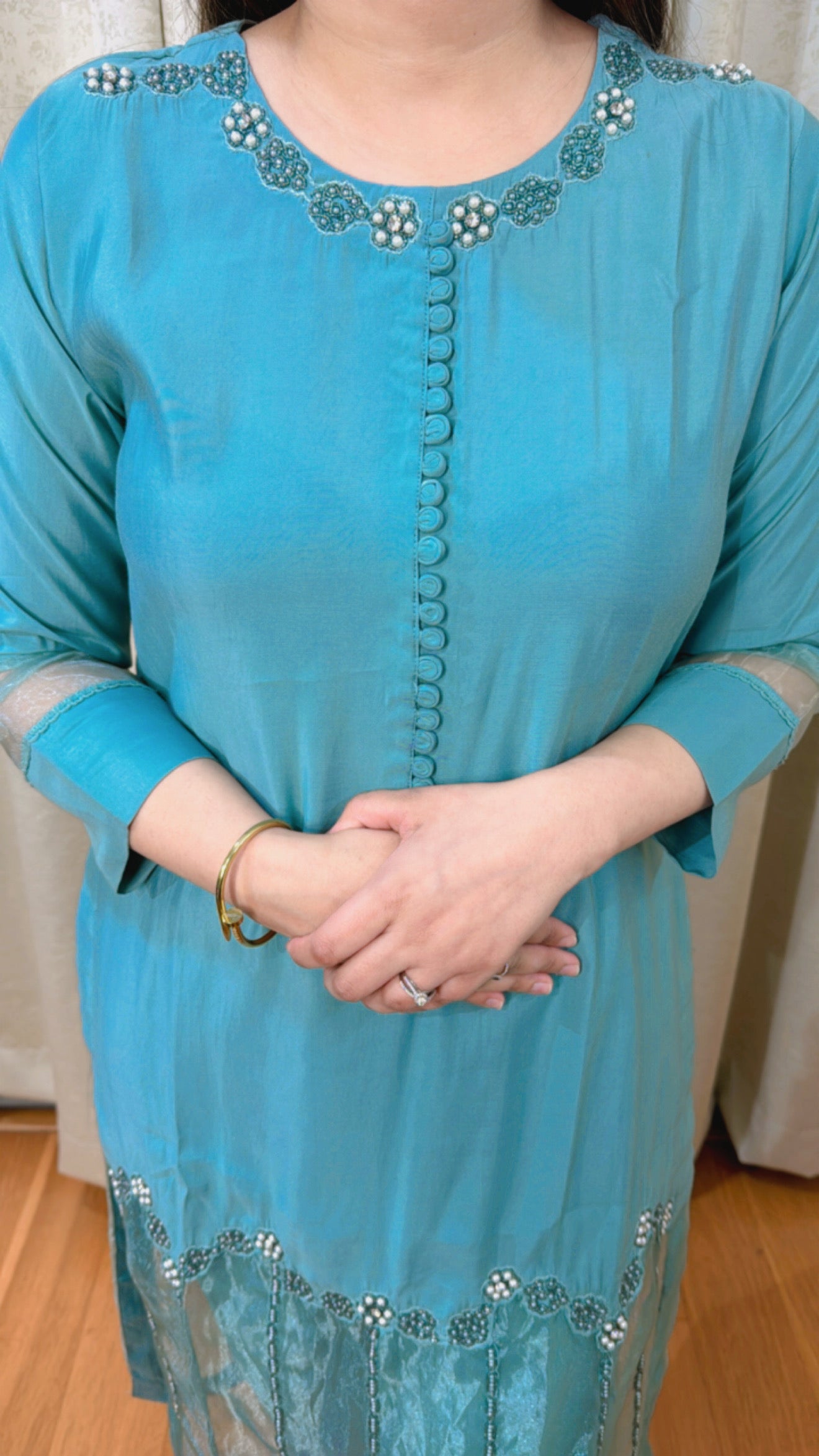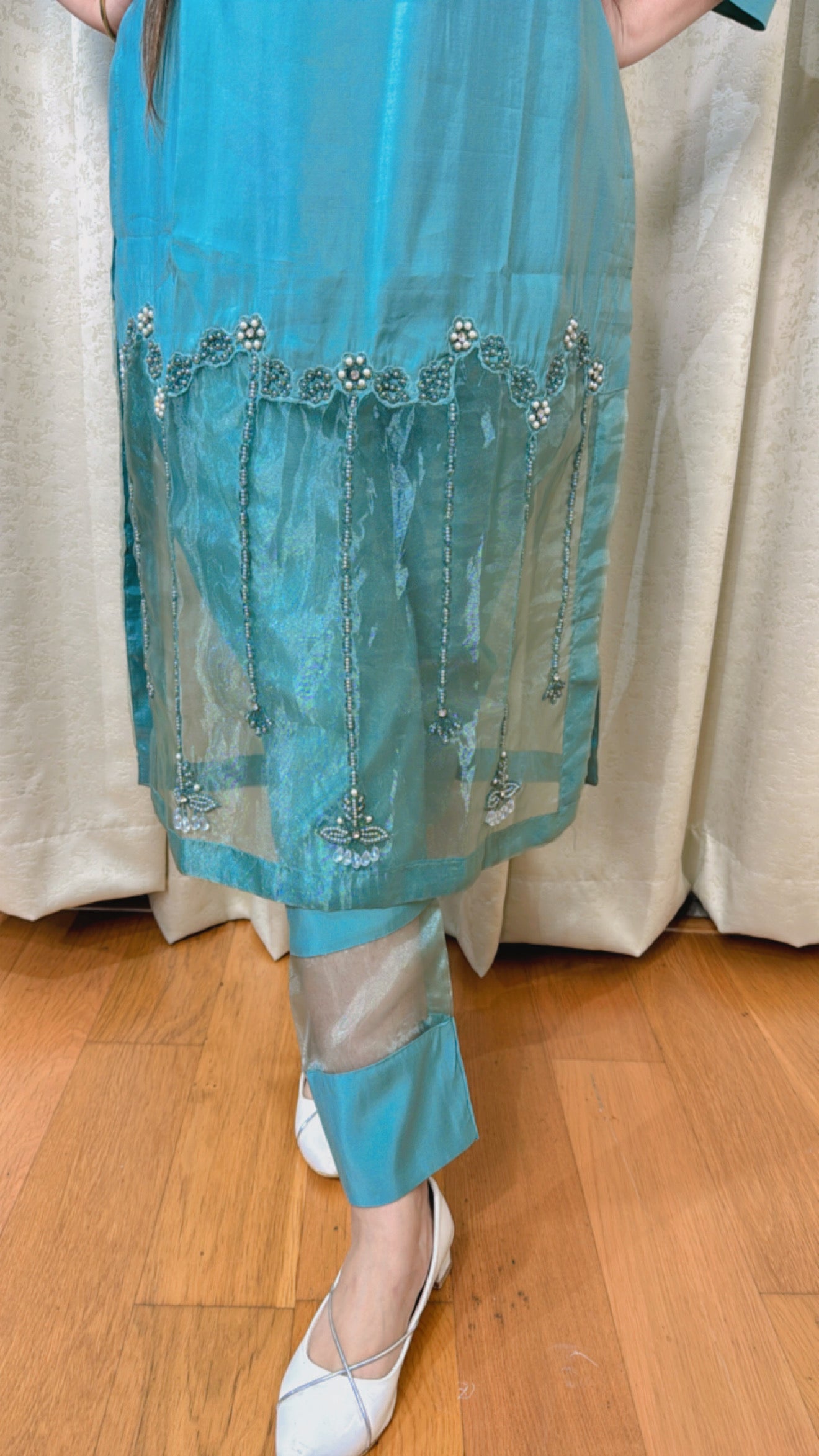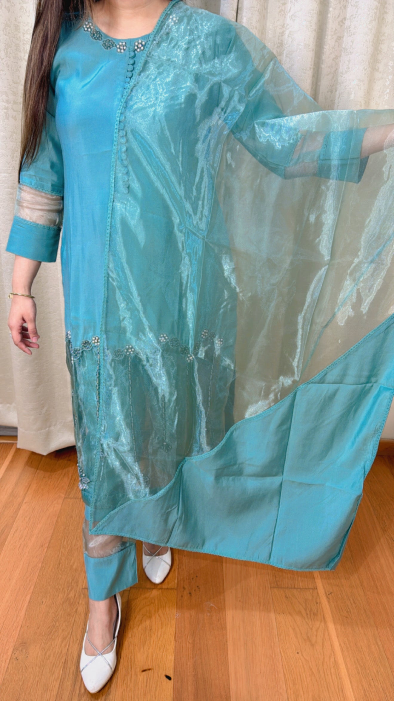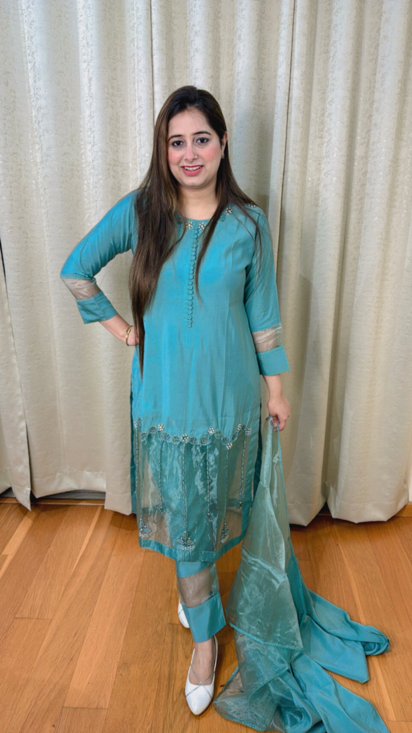This "REET" THREE PIECE KURTA SET (GREEN) is made from pure cotton for a comfortable and lightweight feel. The set includes a kurta with net allover handwork, providing a touch of elegance and sophistication to your outfit. Perfect for any occasion and suitable for all-day wear.