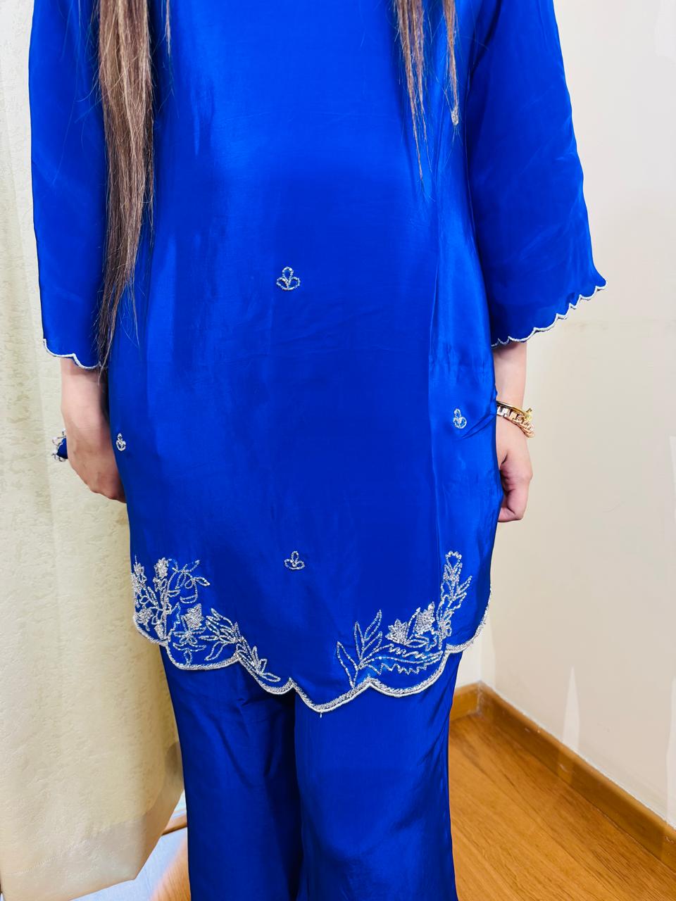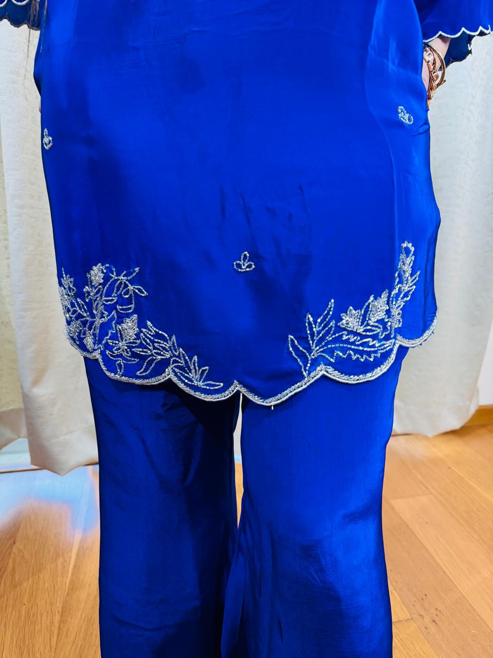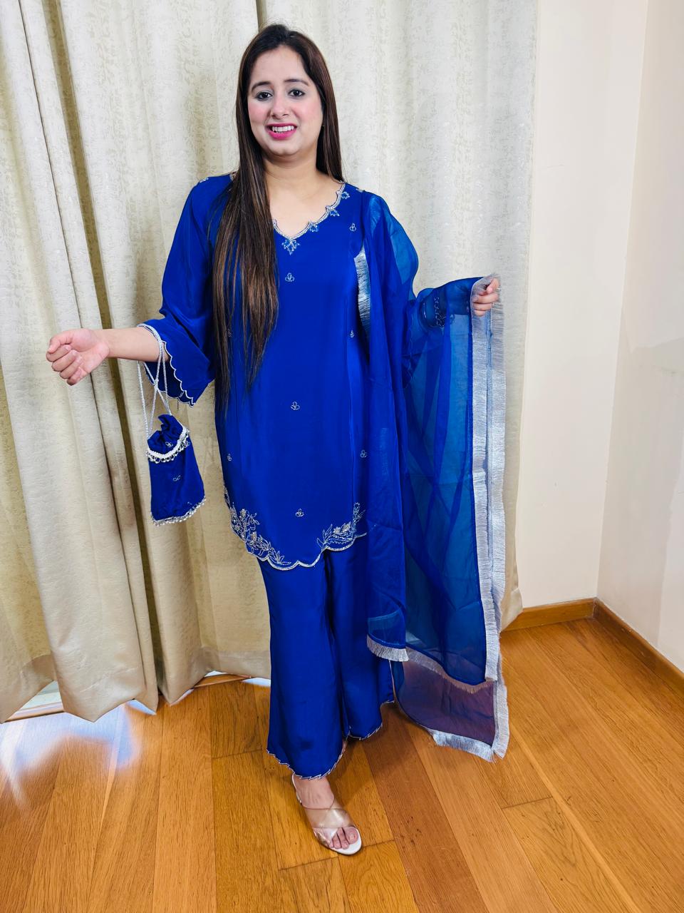 Introducing the "VARTIKA" designer suit with potli. Made of pure crepe, this two-piece set in a stunning blue color is perfect for any occasion. Elevate your style with this high-quality, stylish suit that offers both comfort and elegance.